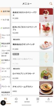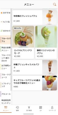 注文はスマホのQRコードで行うスタイルとなっており、フルーツパフェやフルーツサンド、フレンチトーストなどを中心としたスイーツメニューが人気ですが、グラタンやホットサンドメニュー、クロックムッシュ、サラダといったフードメニューやフルーツジュース、アルコールメニューもあります。